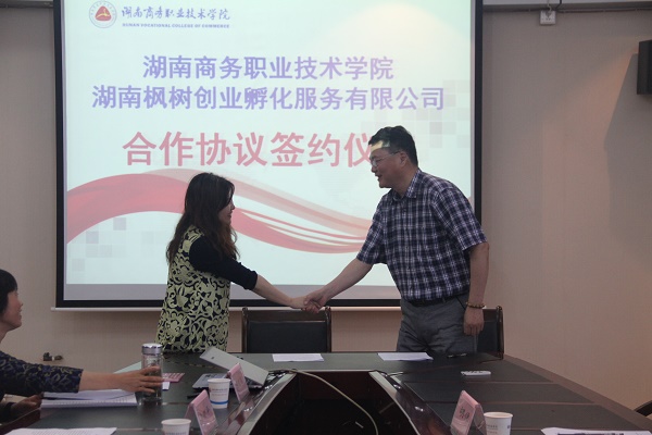 协议明确:为进一步深入贯彻落实党中央国务院关于大力推进大众创业、万众创新的决策部署,深化区校之间的合作,更好的为大学生创新创业提供全方位服务,湖南枫树创业孵化服务有限公司以麓客众创空间为平台,通过举办技术讲座,对学院大学生创新创业团队进行辅导、培训等形式,为高校大学生创新创业提供服务,有效搭建政府、企业、学校、学生的桥梁,共同推进大学生创业创新工作,让学生受益。湖南枫树创业孵化服务有限公首席专家关选国表示:与学院的合作对于他们公司来说是一个新课题、新发展,更是一次机遇与挑战。公司将会在资源引进和公司创业经验等方面对学院提供帮助,使我院创业创新事业得到更好的发展,期待此次合作能取得好成效。
