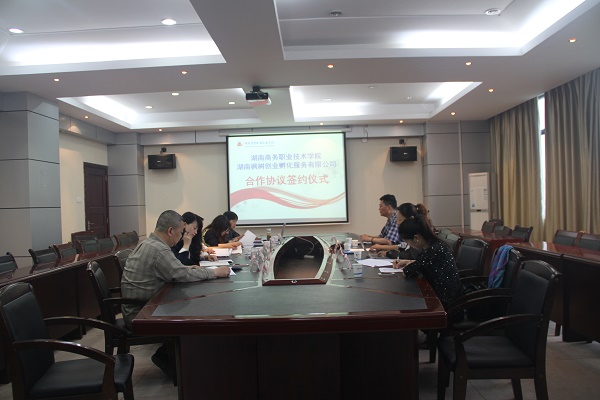 仪式上,陶处长首先对湖南枫树创业孵化服务有限公司一行人的到来表示热烈的欢迎,随后宣读了合作协议条款。经双方讨论确认后,湖南枫树创业孵化服务有限公司胡伟总经理与我院党委委员禹明华教授正式签署了合作协议。