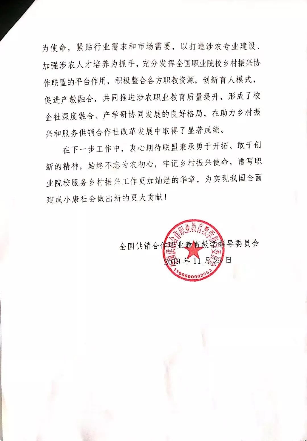 中华全国供销合作总社祝贺全国职业院校乡村振兴协作联盟2019年年会暨湖南千亿果品产业推进乡村振兴发展高峰论坛成功举办的贺信