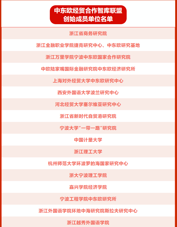 中东欧经贸合作智库联盟是在中国社会科学院中国—中东欧国家智库交流与合作网络、浙江省商务厅、浙江省社会科学院的指导和支持下,由浙江省商务研究院、浙江金融职业学院、浙江万里学院共同发起,协同有关智库、科研院校等组建成立,致力于成为各成员单位成果共建、互学互鉴、汇聚智库的载体,切实为“中东欧经贸合作”提供智力支持。