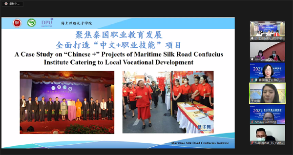 天津师范大学海外孔子学院中方院长王尚雪以《聚焦泰国职业教育发展 全面打造“中文+职业技能”项目》为题作主旨演讲。她从中泰“中文+职业技能”的顶层设计、特色模式、中泰标准对接、校企合作、课程开发、技能竞赛和发展趋势等7个方面,结合海上丝路孔子学院在“中文+职业技能”项目实施过程中的有成经验,对项目实现路径作了系统深入的分析。