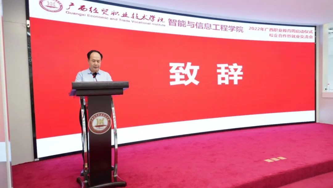 韦群生在致辞中表示,智能与信息工程学院举办校企合作暨就业交流会活动,旨在展示以电子商务专业为首的专业群教学改革成果,是对学生专业技能水平的一次检阅。通过交流会,进一步深化校企协同育人机制,促进我校教育教学高质量发展。此次活动还将面向企业推介我校毕业生就业,拓宽了学生实习、就业的岗位和渠道。