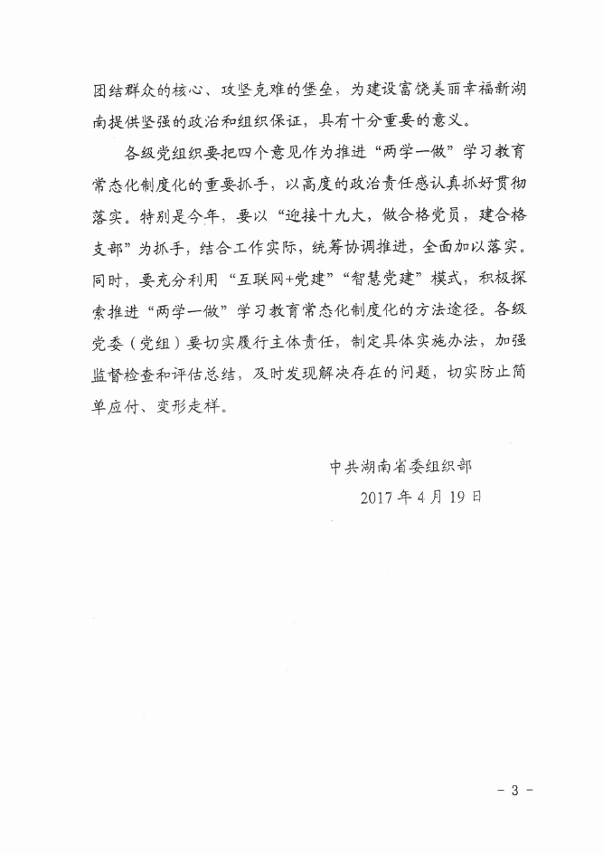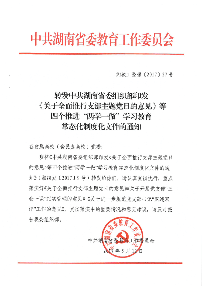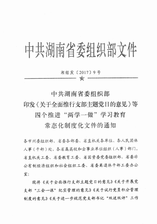 中共湖南省委组织部印发《关于全面推行支部主题党日的意见》等四个推进“两学一做”学习教育常